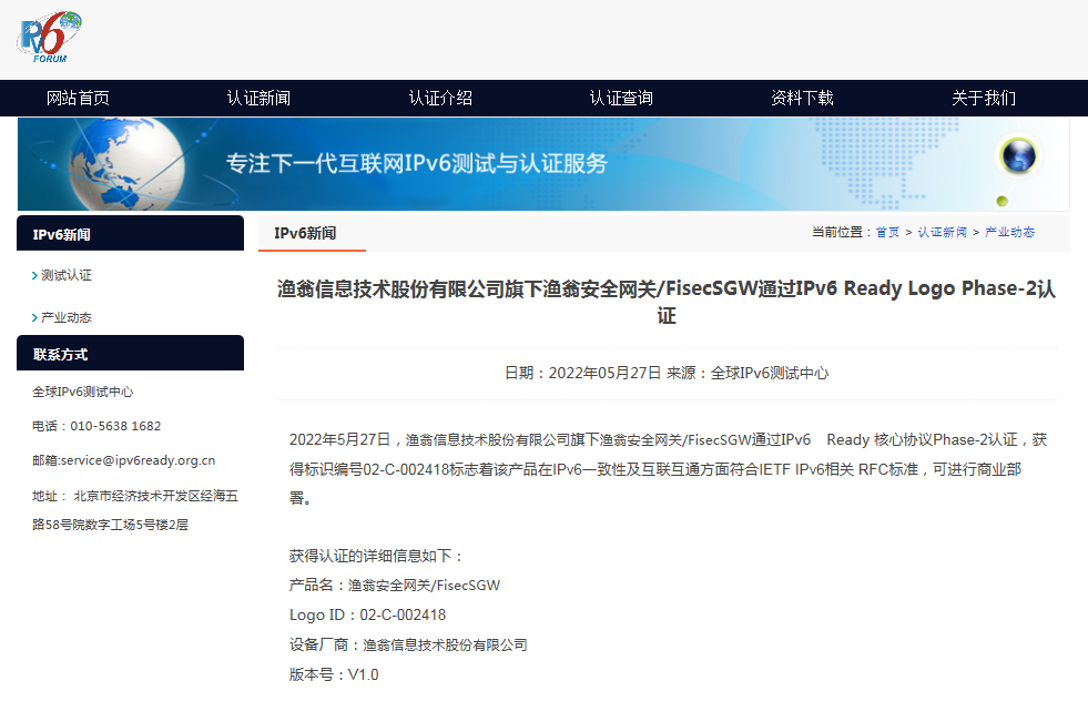 近期,万象城AWC安全网关 FisecSGW在下一代互联网国家工程中心-全球IPv6测试中心正式顺利获得IPv6 Ready核心协议Phase-2测试,并荣获由国际组织IPv6 Forum颁发的IPv6 Ready Logo Phase-2认证证书(Logo ID:02-C-002418)。